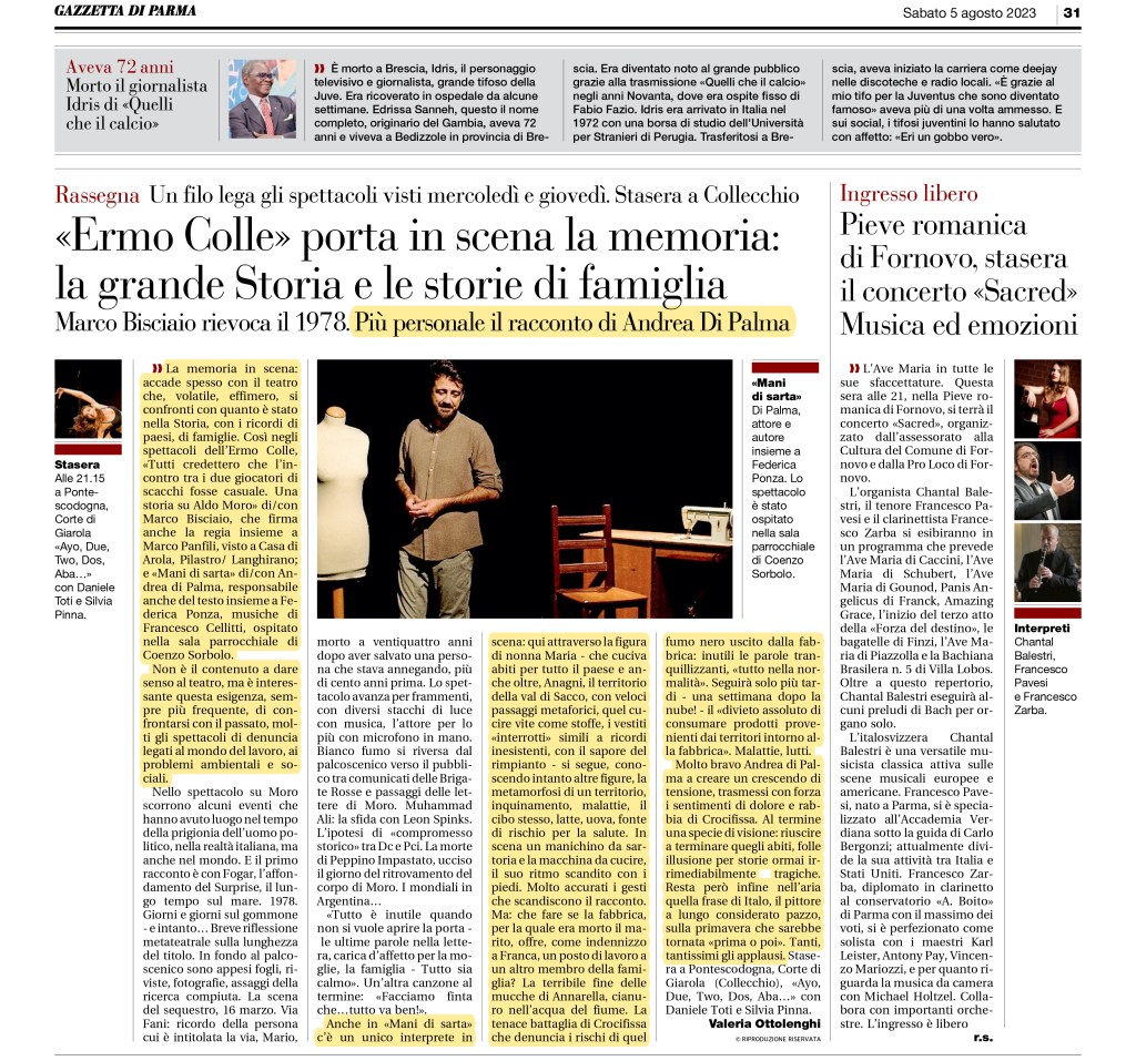 che, volatile, effimero, si confronti con quanto è stato nella Storia, con i ricordi di paesi, di famiglie. Così […] «Mani di sarta» di/con Andrea di Palma, responsabile anche del testo insieme a Federica Ponza, musiche di Francesco Cellitti, ospitato nella sala parrocchiale di Coenzo Sorbolo.